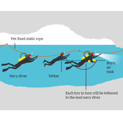 15.00 Cómo están sacando a los chicos de la cueva. Cada niño usa una máscara de buceo de cara completa, además de un traje, botas y un casco. Dos buzos de la Marina acompañarán a cada niño y uno de los buzos lleva el tanque de aire del niño. Una cuerda de 8mm servirá de guía para avanzar bajo el agua.