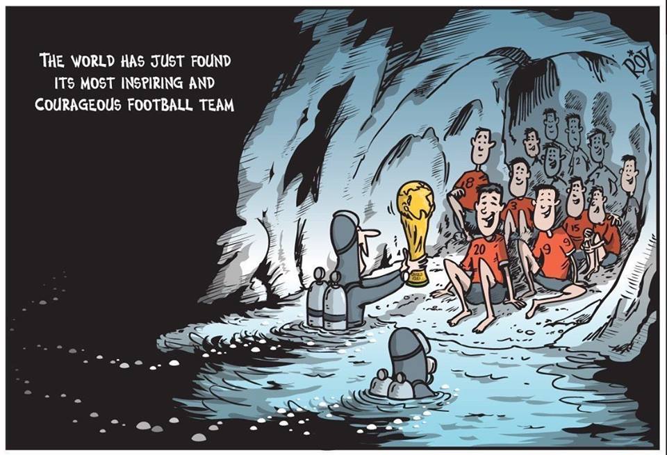 21.30 La Copa del Mundo ha encontrado al equipo más valiente e inspirador, dice una viñeta en homenaje a la resistencia de los chicos del equipo de fútbol y su entrenador que quedaron atrapados en la cueva Tham Luang desde el 23 de junio.