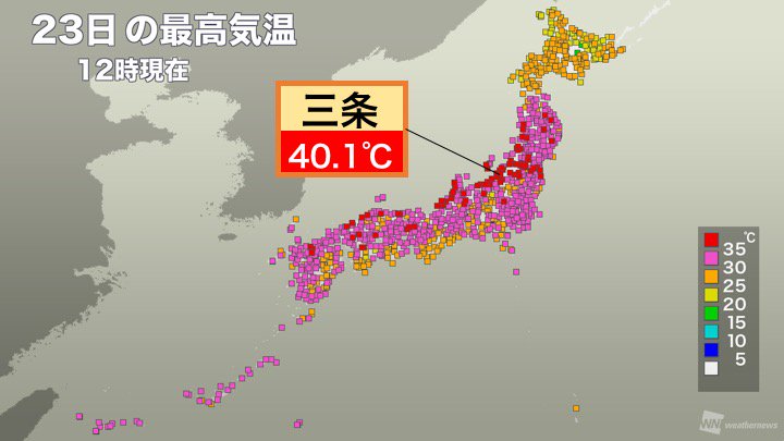 – Mientras el tifón 20 se acerca por el sur, se registra récord de calor por el norte. Wather News dijo que hoy a las 11.54hrs la ciudad de Sanjo, en Niigata, registró un calor de 40,1 ℃. Es la primera vez que el termómetro pasa de los 40ºC desde que se comenzó a observar la temperatura en la región de Hokuriku.