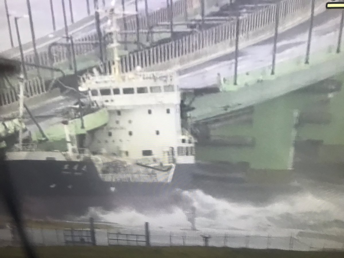 16.50 hrs Un buque cisterna que se encontraba anclado en el puerto fue arrastrado por la corriente y los violentos vientos del tifón 21 y se estrelló contra un puente que une la ciudad con el aeropuerto de Kansai. El accidente ocurrió poco después de la 1 de esta tarde. En el barco, de 87 metros de eslora y 1591 toneladas iban 11 tripulantes. Ninguno resultó herido, dijo la Guardia Costera a NHK.