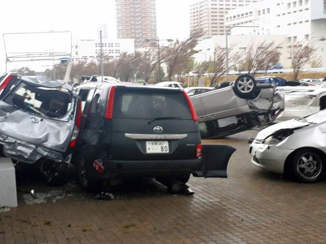 20.00 hrs En Osaka no se ha visto nada igual. Poco antes de las 14 horas, los vientos huracanados del tifón 21 levantaron por el aire 20 vehículos que estaban en el estacionamiento del Gobierno Prefectural de Osaka. Varias ventanas del primer piso se hicieron trizas.