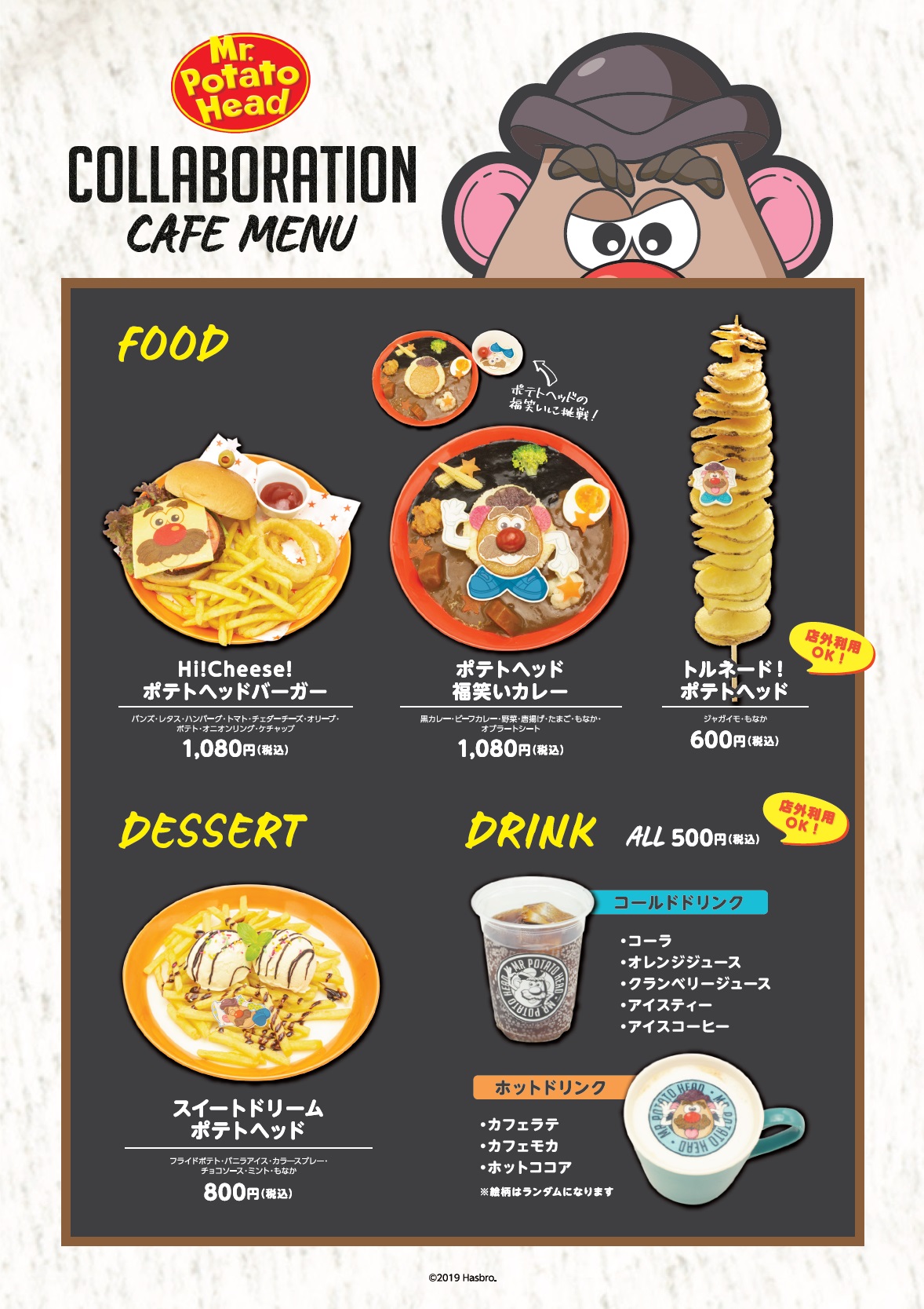 La cafetería de este personaje en Tokio ofrecerá 4 variedades de comidas y 8 tipos de bebidas. Las comidas son「ポテトヘッドの福笑いカレー Potato Head no Fukuwarai Karee 」, 「 Hi! Cheese! ポテトヘッドバーガー Hi! Cheese! Potato Head Burger 」, 「 スイートドリームポテトヘッド Sweet Dream Potato Head 」y「 トルネード!ポテトヘッド Tornado! Potato Head 」 (Súper Tokio Radio)