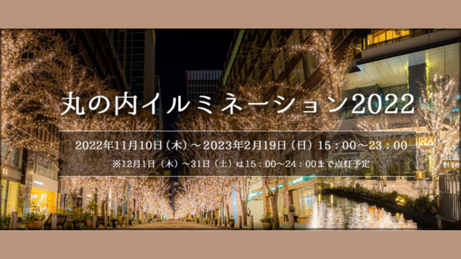Descripción: la anual iluminación de invierno del área de Marunouchi brillará nuevamente de color dorado champán. Alrededor de 340 árboles iluminarán las calles con bombillas LED de la ciudad.