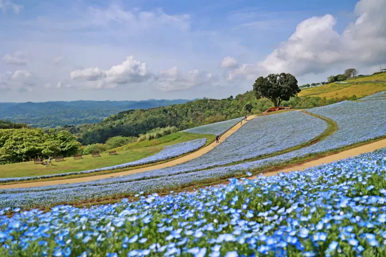 El período de la Semana Dorada es el momento perfecto para visitarla y disfrutar de este maravilloso valle de flores, donde un millón de plantas de nemophila decoran el campo con un refrescante color azul.