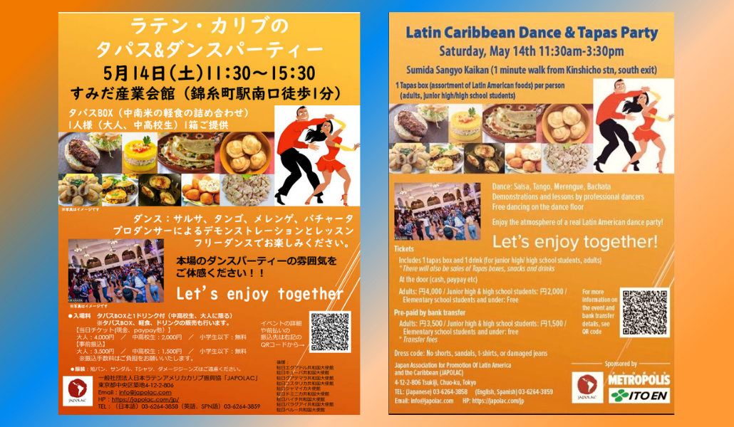 「ラテンとカリブのタパス&ダンスパーティー, Latin to Caribbean no Dance&Tapas Party 」 Fecha: 14 de mayo Lugar: Sumida Sangyo Kaikan Horario: 11.30 – 15.30 Acceso: A 1 minuto de la estación Kinshicho (JR) Entrada: Adultos: 4.000 yenes, estudiantes de secundaria: 2.000 yenes, niños de primaria: gratis ※ Incluye una caja de tapas (piqueos) y una bebida. https://metropolisjapan.com/event/latin-america-and-caribbean-tapas-party/ Descripción: Una […]